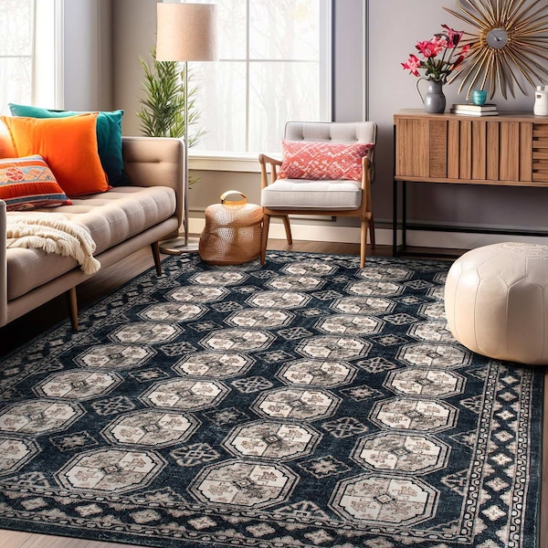 Craft ed with machine-made precision, this Bokhara-inspired oriental rug showcases classic geometric medallions and an elegant border design, adding depth and sophistication to any room. The plush pile provides a cozy yet durable surface, while the machine-washable polyester fibers make cleaning stress-free. A non-slip backing enhances safety, ensuring both traditional charm and modern functionality. Machine-Washable for Effortless Maintenance: Say goodbye to the hassle of spot cleaning-our rugs are fully machine washable, making upkeep simple and stress-free. Made from high-quality synthetic polyester, they maintain their shape and soft ness even aft er multiple washes. For small rugs, a standard home washer works perfectly, while larger sizes may require a commercial machine. Non-Slip Backing for Added Safety: No more shift ing or sliding-our rugs come with a durable, non-slip backing that keeps them securely in place on hard floors. Designed for kid- and pet-friendly homes, they prevent trips and falls while offering a stain-resistant, shed-free surface that stands up to daily messes. Soft & Comfortable for Everyday Living: Experience luxurious soft ness underfoot with our cozy, plush pile-perfect for busy households. Whether It's muddy paw prints or everyday spills, our rugs are built to withstand it all while adding warmth and style to any space. Eco-Friendly, Convenient Shipping: Shipped folded for reduced packaging waste. Simply lay flat upon arrival, and the rug will regain It's shape in a few days. Color and size may vary slightly due to screen settings. Vacuum carefully without a beater bar. Machine wash under a cold and gentle cycle. Do not use bleach. Line dry. Professional cleaning is recommended for stubborn stains. Please note that this machine-washable rug may shrink by 1-2 inches aft er the first wash.