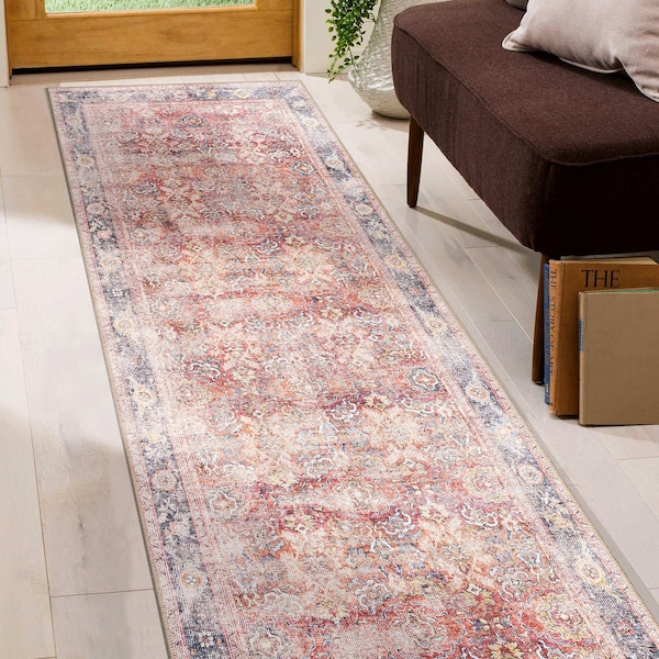 Vintage Bordered Machine Washable Non Slip Runner Rug 2 ft 6 in x 7 ft Red