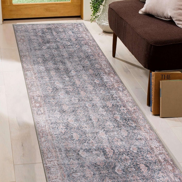 Vintage Inspired Bordered Machine Washable Runner Rug 2 ft 6 in x 7 ft Charcoal