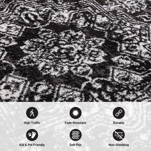 Bring a sophisticated sense of history to your home with this vintage-style black and ivory area rug. Its classic medallion motif and artfully distressed texture give it the feel of a treasured heirloom - without the high price tag. Made from durable polypropylene with a jute backing, this rug offers everyday performance while maintaining a soft, inviting texture. It’s an ideal choice for those who love timeless style with modern convenience. Durability & Safety: Designed for long-lasting durability, this rug is a reliable choice for high-traffic spaces throughout your home. Crafted from safe, non-toxic materials, it provides a comfortable and secure surface for kids and pets. The sturdy jute backing enhances stability and longevity, ensuring years of dependable use. To prevent shifting and extend the life of your rug, we recommend using a rug pad for added safety and comfort. Comfort & Convenience: Expertly machine-woven using advanced technology, this rug offers the perfect balance of softness and durability. Its versatile design makes it an excellent addition to any room, effortlessly complementing various home decor styles. Available in a range of sizes, it fits seamlessly into different spaces. Designed for effortless maintenance, it requires only regular vacuuming and simple spot cleaning with mild detergent to maintain its beauty. Please note: While we strive for accuracy in our digital images, actual rug colors may vary slightly due to monitor settings. Minor variations in length and width may occur due to the manufacturing process, and patterns may adjust slightly depending on the selected size and shape. Spot clean with a solution of mild detergent and water or clean professionally. Regular vacuuming help rugs remain attractive and serviceable.