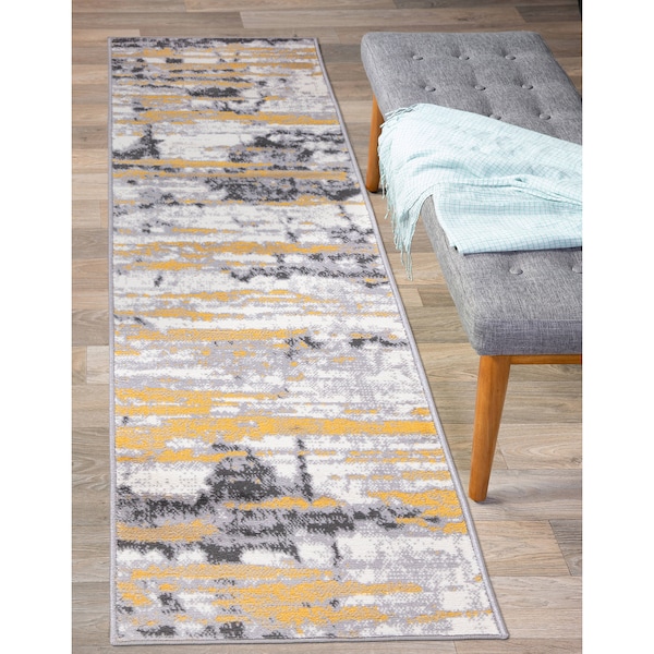 Vintage Modern Abstract Yellow/Gray/Ivory Runner Rug 2'x7'