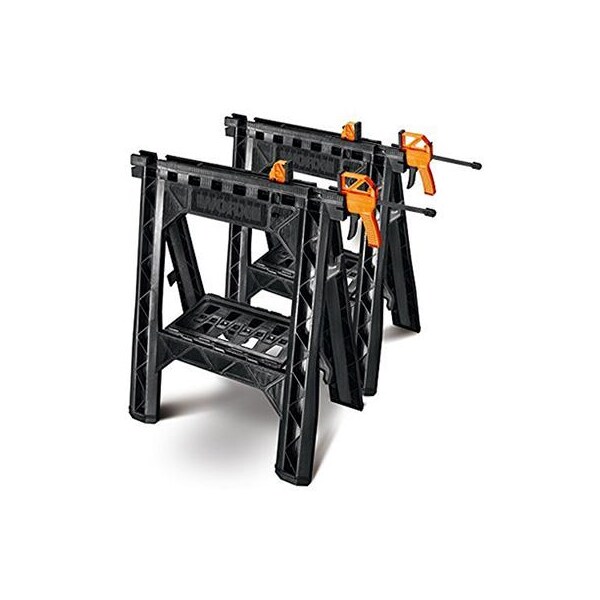 WORX Versatile sawhorses have built-in clamping system. Hold large or small items in vertical or horizontal positions. Great for projects around the house, shop or jobsite. FEATURES: Specially designed bar clamps can fasten directly to the sawhorse. Bar clamps can be oriented to hold work in either horizontal or vertical positions. Clamps can be removed for use as a standard sawhorse. Built-in shelf and cord hooks for storing tools and materials. Indentations in the top hold 2-by lumber for cutting or supporting sheet goods.