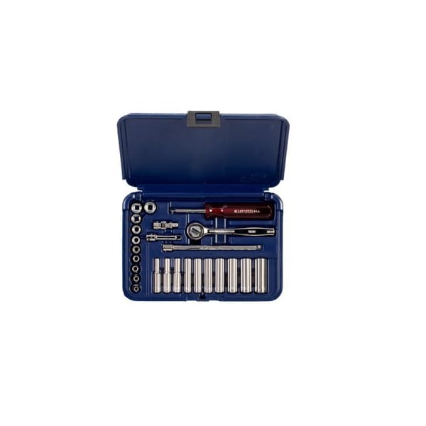 Includes 1/4 in. drive 6-point standard sockets in 5/32 in. to 1/2 in. sizes; 6-point deep sockets in 3/16 in. to 1/2 in. sizes; 12-point deep sockets in 9/16 in. Also includes #2492 contour handle round head ratchet, #2402 2 in. extension, #2406 6 in. extension, #2441 6 in. spinner, #2475 universal and blow molded case. 6 Point Standard Sockets 5/32 in.,1/2 in., 6 Point Deep Sockets 3/16 in.,1/2 in., 12 Pt Deep Socket 9/16 in., Ratchet, Spinner, Universal, 2 in. & 6 in. Extensions