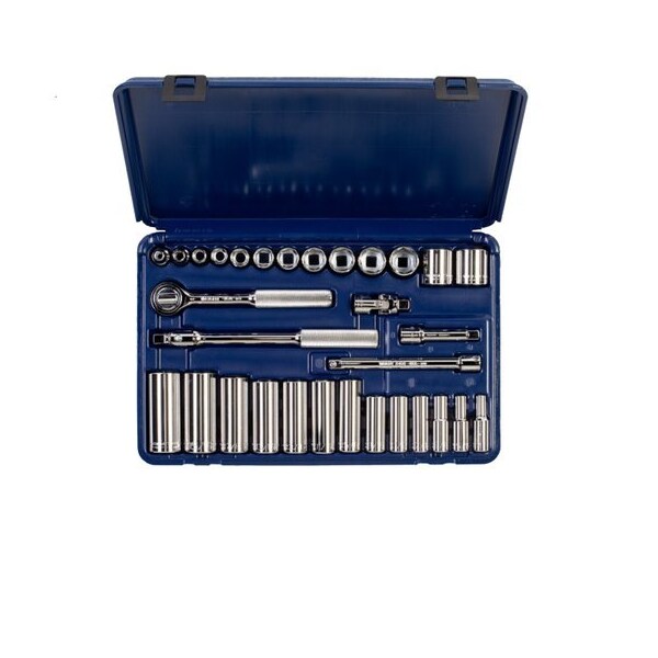 Includes 3/8 in. drive 6-point standard and deep sockets in sizes 1/4 in. to 1 in. Also includes #3403 3 in. extension, #3405 6 in. extension, #3475 universal, #3435 knurled steel flex handle and blow molded case.