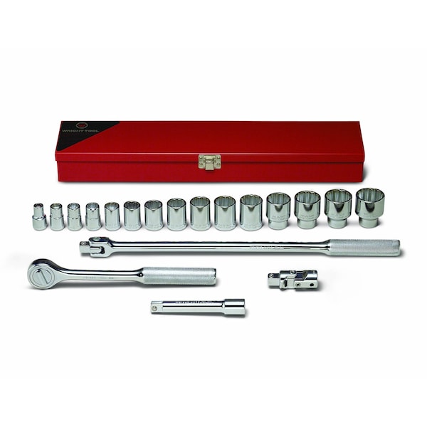 (15) 1/2" Drive 12 Point Standard Socket: 3/8", 7/16", 1/2", 9/16", 5/8", 11/16", 3/4", 13/16", 7/8", 15/16", 1", 1-1/16", 1-1/8", 1-3/16", 1-1/4"; (1) Ratchet; (1) 5" Extension; (1) Flex Handle; (1) Universal; (1) Metal Box