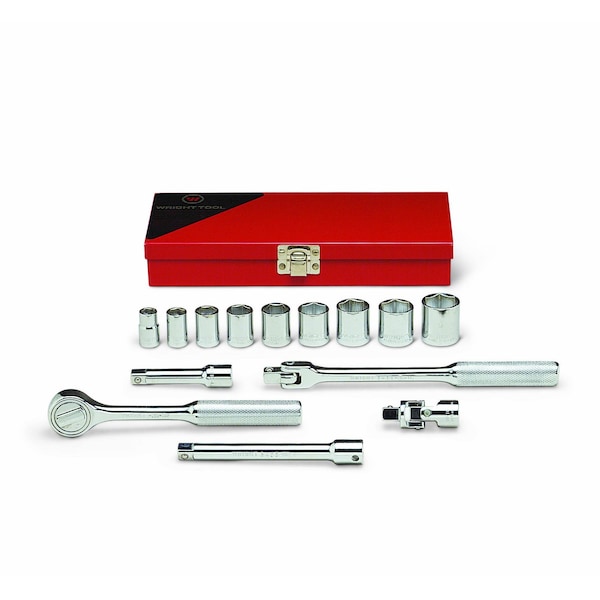 (9) 3/8" Drive 6 Point Standard Socket: 3/8", 7/16", 1/2", 9/16", 5/8", 11/16", 3/4", 13/16", 7/8"; (1) Ratchet; (2) Extensions: 3", 6"; (1) Flex Handle; (1) Universal; (1) Metal Box