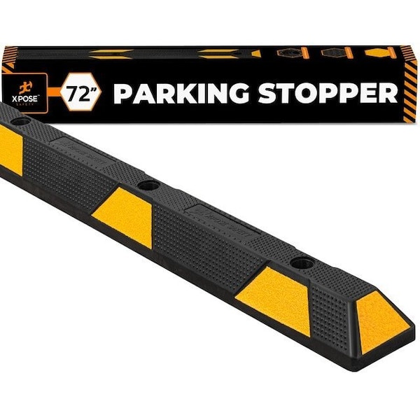 Reduce impact damage and wear and tear to vehicles with this 6 ft. rubber wheel stop from Xpose Safety. One extra wide piece can safely support a max load capacity of 44,000 lbs when properly installed. Create permanent or temporary parking assistance in garages, warehouses, business lots and beyond.PRODUCT FEATURES:Dimensions: 72 in L x 5.85 in W x 4 in HLow Profile DesignBright Yellow Reflective StripsPre-Drilled Mounting HolesHardware Not IncludedLOWER PROFILE DESIGNWith a height of 4 inches, these rubber wheel stops for a parking lot are low enough to protect most new cars with low ground clearance.INDUSTRIAL GRADE RUBBERIndustrial grade rubber is resistant to extreme temperature, moisture damage, sunlight, cracking, oil, solvents, gas and the seasonal weather changes.REFLECTIVE SAFETY STRIPSReflective yellow safety strips on the sides and ends offer high visibility during the daytime and at night.PERMANENT OR TEMPORARY INSTALLATIONUse 4 expansion bolts in the pre-drilled holes to permanently install the parking block concrete or asphalt in designated areas. Use in garages, driveways, shopping centers, business parking, warehouses and industrial facilities.Hardware not included.Overcome workplace hazards and job site challenges with the reliable safety and security of Xpose Safety.