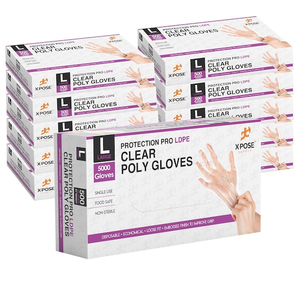 Keep your hands clean and keep food in sanitary condition with Clear Poly Gloves. These transparent plastic gloves are made from low density polyethylene LDPE for flexibility and unrestricted movement and comfort.PRODUCT FEATURES:500 CountLDPE PlasticSingle UseFood SafeNon-SterileLoose FitEmbossed FinishAvailable in Medium and LargeBENEFITS OF LOW DENSITY POLYETHYLENE LDPELDPE plastic is flexible with low tensile strength, meaning it can withstand a lot of stretch before it breaks. The material is moisture resistant, chemical resistant, and resistant to high temperatures.FOOD SERVICE AND FOOD HANDLINGThese single-use disposable gloves create a sanitary barrier between skin and food. Ideal for food preparation, kitchen use with raw meat, and food service that requires frequent glove changing, like sandwich and sub making. Keeps your hands and under fingernails clean. Non-toxic and odor free.BETTER FOR GRIPPINGAn embossed exterior makes these disposable gloves the superior choice over nitrile and rubber gloves when it comes to food prep and food handling. Handle sticky work with ease. Pick up and place small toppings with perfect precision.MULTIPURPOSE CLEAR GLOVESUse them for hair dye and hair coloring, painting and staining, DIY home projects, arts and crafts, counter tasks, dishwashing, cleaning, and any situation where you want to minimize cleanup at the end. Great for eating wings, saucy ribs, crab legs, seafood, and more.Clear poly gloves are economical, cost-effective, and create a smaller footprint compared to nitrile, rubber, and latex gloves.