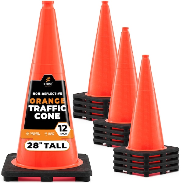 - Regulation Compliant: All Xpose Safety cones are non-reflective, with a black base, and meet MUTCD specifications. Perfect for road hazard marking, vehicle stoppage, or traffic control, these durable cones ensure maximum visibility for safety applications. Available Options: - Sizes: 12", 18", 28", 36" (Slimline and Regular Options) - Colors: Orange, Lime Green - Base Options: Regular, Heavier, Pounder Base (for added stability) - Color Variations: No Color, Single-color or two-color options (6-inch and 4-inch color bands) - Pack Options: 1 Pack, 4 Pack, 8 Pack, 12 Pack, 24 Pack, 48 Pack - Weight Variations: Standard, Heavy Duty for extra weight and stability Perfect for Any Situation: Xpose Safety cones are ideal for organizing events, managing traffic, marking hazards, or ensuring safety in any environment. Whether for professional or home use, our cones provide reliable performance, durability, and peace of mind. All Xpose Safety cones are backed by our satisfaction guarantee, ensuring you get the best quality for your needs.