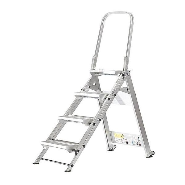 Step Stool Product Group Folding Step, Number of Steps 4, Overall Height 4.9 ft, Material Aluminum, ANSI Type IAA, Load Capacity 375 lb, Top Step Height 35 in, Top Step Depth 8 in, Bottom Width 43 1/2 in, Base Depth 45 in, Color Silver, Series Contractor, Closed Depth 5 in, Closed Height 59 in, Standards ANSI, Net Weight 28 lb, Step Width 14 in
