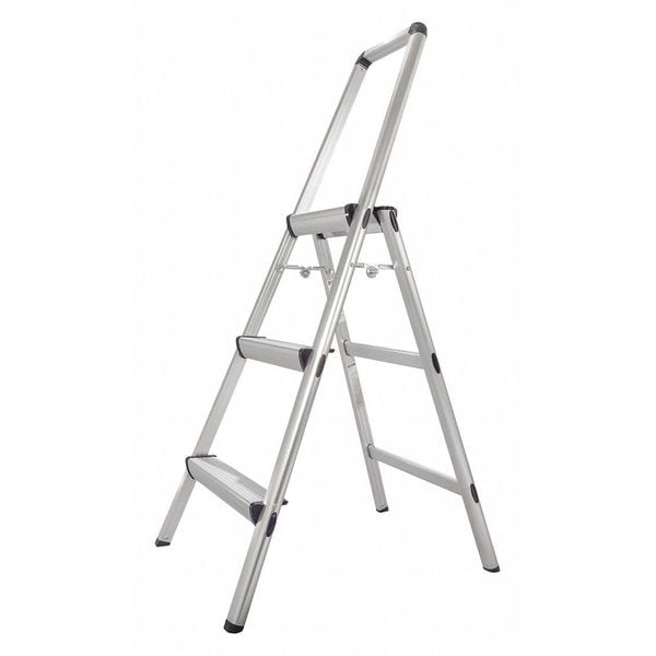 Step Stool Product Group Folding Step, Number of Steps 3, Overall Height 3.6 ft, Material Aluminum, ANSI Type II, Load Capacity 225 lb, Top Step Height 26 in, Top Step Depth 6.5 in, Bottom Width 18 in, Base Depth 26 in, Color Silver, Finish Anodized, Closed Depth 3 in, Closed Height 52 in, Includes Slip Resistant Feet, Standards ANSI, Step Tread Ribbed, Net Weight 8 lb, Step Width 11 in