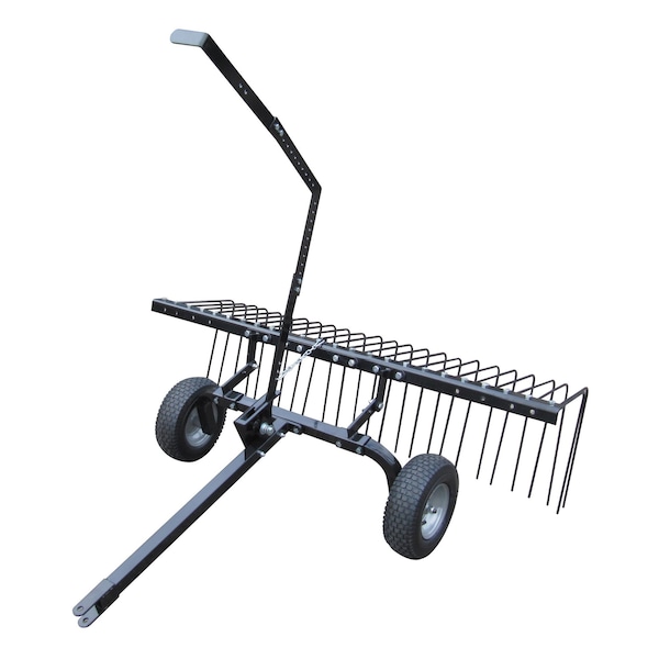 Yard Tuff’s YTF-60PSR 60” Pine Straw Rake covers a working width of 60” to help you cover a lot of ground at once. The rake contains twenty-four, 5/16” spring steel tines for optimal performance, durability, and reliability to ensure that you can get the job done. The 12” pneumatic tires provide you with easy maneuverability over various terrains. Constructed of durable steel with a powder-coat paint finish to resist corrosion, this Yard Tuff rake gives you a rake that will last. The rake features a lift handle to conveniently drop your collection, making your job nearly effortless. Quickly and effectively rake pine needles/straw, leaves, grass, and debris with the Pine Straw Rake.