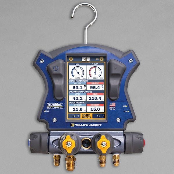 Manifold Gauge, Number of Valves 4, Number of Hoses 4, 5 ft, CE Listed, Includes (2) Titan Clamp Probes, Hoses, Vacuum Gauge