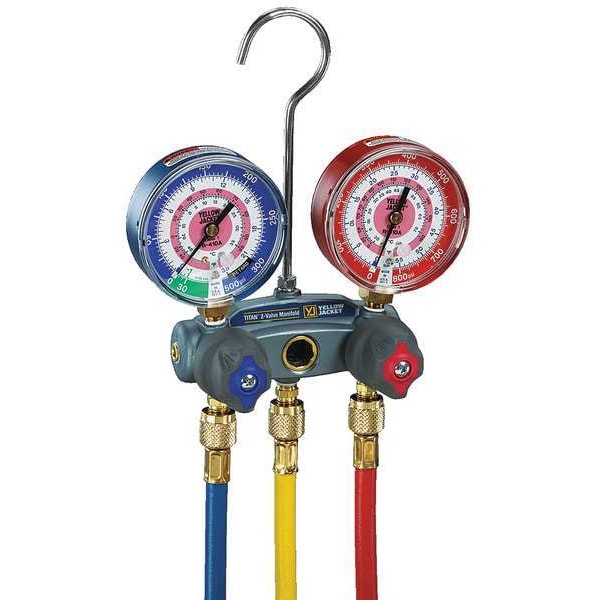 Manifold Gauge, Number of Valves 2, R-134A, Number of Hoses 3, 6 ft, 0 to 500 psig, 30 in Hg to 120 psi, 1/4 in, Forged Aluminum Alloy, Forged with 3-1/8 in dia High and Low Side Gauges, Valves Utilize Double O-Ring Piston, Includes Not Applicable