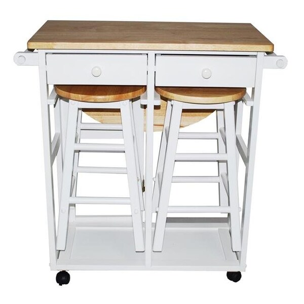When it's time for breakfast, convenience counts! This very attractive Drop-Leaf Breakfast Cart is made of 100% solid hardwood, and it's stylish enough to put a great smile on your morning.It features a space-saving design with drop-leaf table top, two drawers and two towel bars!.Also included are two solid wood stools which can be stored right in the cart.Stools are 24" high.Table surface - 15"L x 28"W x 33"H - with drop leaf - 30"L x 28"W x 33"H.Assembly level/degree of difficulty: Easy. Length: 27.75 Height: 33.12 Width: 16