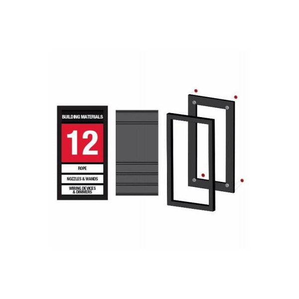Designed for use where End Cap Hardware Kit TRV0001 cannot be used Applies to flat surface with provided Dual Lock Pieces Accepts Department, Aisle, and Category Inserts Overall size is 12 wide x 22 tall