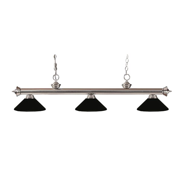 Elegant and traditional best describes this beautiful three light fixture. Finished in brushed nickel and paired with metal matte black shades, this three light fixture would be equally at home in the game room, or anywhere else in the house needing a touch of timeless charm