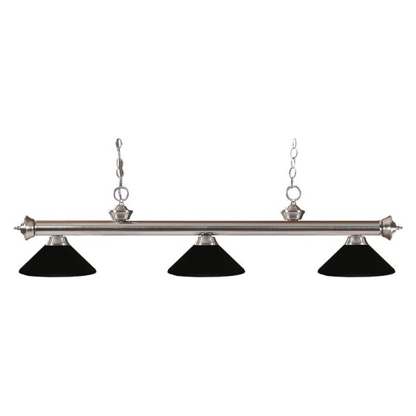 Elegant and traditional best describes this beautiful three light fixture. Finished in brushed nickel and paired with metal matte black shades, this three light fixture would be equally at home in the game room, or anywhere else in the house needing a touch of timeless charm