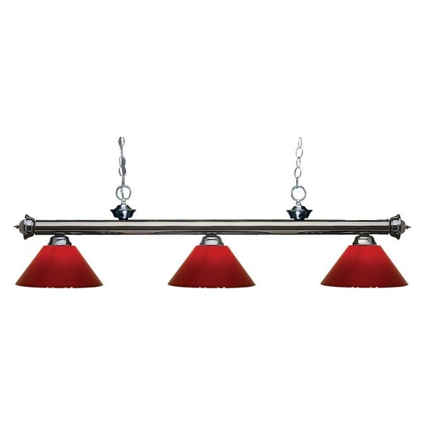 Finished in gun metal this three light bar fixture uses plastic red shades to create a contemporary look with a timeless quality to it. This fixture would be perfect for the game room, or any other room of the house where a touch of under stated sophistication is needed.