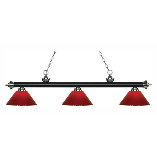Elegant and traditional best describes this beautiful three light fixture. Finished in Matte Black + Brushed Nickel and paired with Red Plastic shades, this three light fixture would be equally at home in the game room, or anywhere else in the house needing a touch of timeless charm.