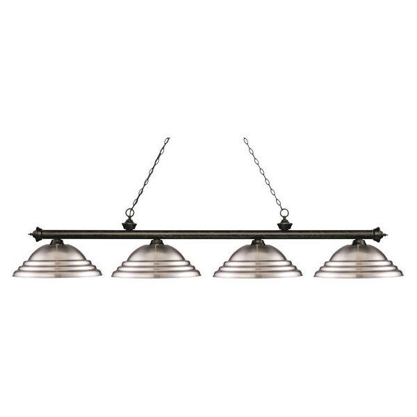 Finished in golden bronze this four light bar fixture uses stepped brushed nickel metal shades to create a contemporary look with a timeless quality to it. This fixture would be perfect for the game room, or any other room of the house where a touch of under stated sophistication is needed.