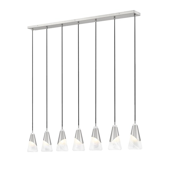 Infuse sophistication over a kitchen island or large dining table with this impressive modern seven-light linear chandelier. Shrouds of brushed nickel finish metal encircle swirling artisan glass, creating a chic curve that captures attention in any setting.