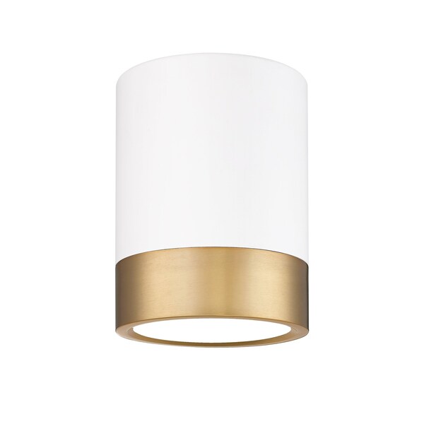 A dual finish palette blends matte white and modern gold steel in a cylindrical shape as this classic one-light flush mount ceiling light complements a kitchen, hallway, or living area. Enjoy dimmable illumination with options for customizable white color values.