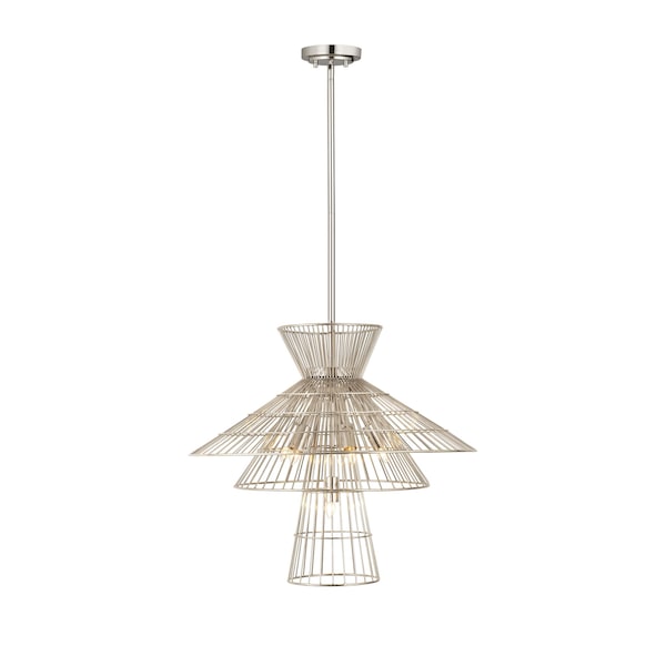 Offer up an energetic look while choosing lighting in a custom space, adding the Alito six-light pendant to steal the show. Gleaming polished nickel finish iron crafts a tiered geometric arrangement of wired pieces and matching down rod and canopy. This striking fixture reflects a blend of industrial and modern styling.
