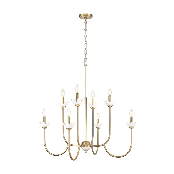 Dive into vintage charm with the floral details and inviting modern gold finish featured on this transitional eight-light chandelier. A dazzling choice over a dining table or foyer, it features delicately curves arms and interchangeable bobeches that resemble flower petals, adding unmistakable feminine charm.