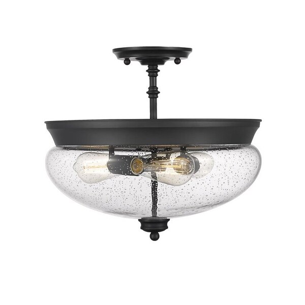 Building on an iconic schoolhouse theme, this three-light semi-flush mount ceiling light offers a stylish source of illumination for a transitional space. Presenting a gorgeous contrast and ornate detailing, its Matte Black finish metal accents make a Seedy Glass dome shade appeal to the mysterious at heart.