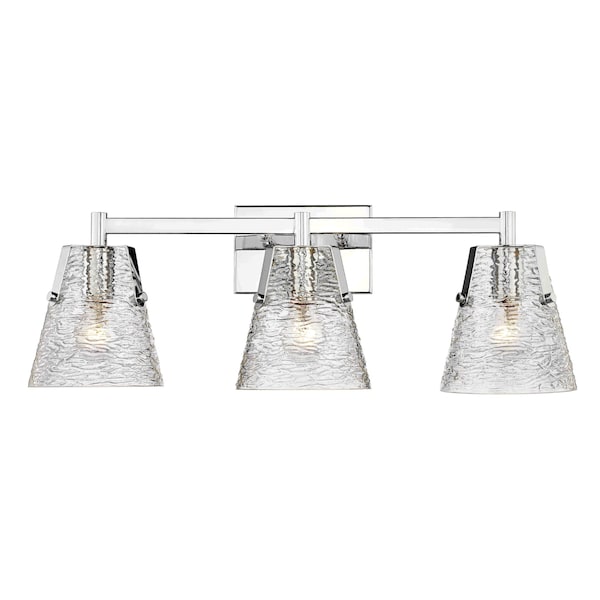 A gleaming chrome finish steel frame shapes this chic three-light vanity bath light, a superb choice for adding elegance and ambient lighting. Crowning a custom vanity, this fixture from the Analia collection brings a bit of nautical charm with a trio of conical shades fashioned of clear textured glass. Choose this three-light vanity light to dress up a contemporary or transitional ensuite or guest bath.