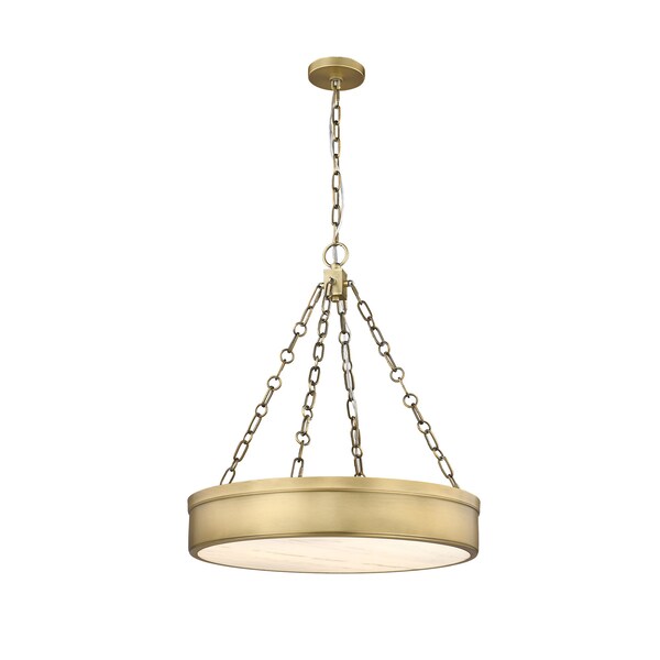 Versatile in design, this three-light LED pendant light suits decor schemes from industrial to modern and adds a sleek minimalist look. From the Anders collection, it features a stylish rubbed brass finish steel circular frame suspended from cable chains reinforcing a symmetrical aesthetic. With a translucent alabaster diffuser, soft ambient lighting adds a warm glow to kitchens, living areas, and entryways.