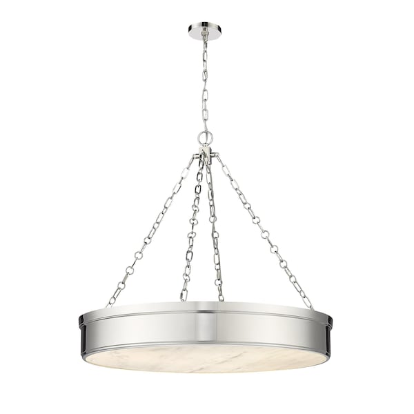 Classic simplicity takes on a circular silhouette in an LED pendant light that suits decor schemes from industrial to modern and adds a sleek minimalist look. From the Anders collection, this three-light LED pendant features a gleaming polished nickel finish steel circular frame suspended from cable chains reinforcing a symmetrical aesthetic. With a translucent alabaster diffuser, soft ambient lighting adds a warm glow to kitchens, living areas, and entryways.
