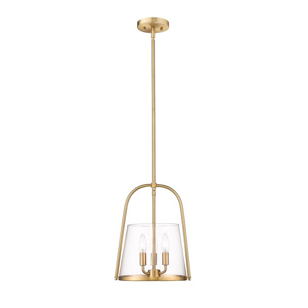 A bit of nautical charm and a decadent mix of materials complement this three-light pendant from the Archis collection, delivering transitional style elements perfect for any space. Framing of modern gold finish steel emulates an open bell silhouette with a romantic clear glass shade positioned at its bottom. Candelabra lamping changes up the mood with a softening effect, making this pendant a superb option for a trending minimalist modern or transitional setting.