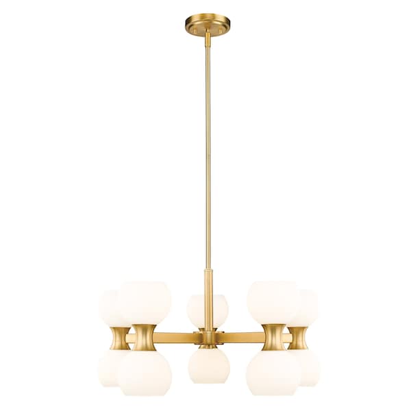 Lush modern gold finish steel begins a decadent journey toward a reworked Mid-Century Modern motif in a 10-light chandelier from the Artemis collection. Perfectly blending linear elements with chic concave shapes, this transitional fixture illuminates a dining space, living room, or entryway with delicate opal glass shades and adds a pop of attitude.