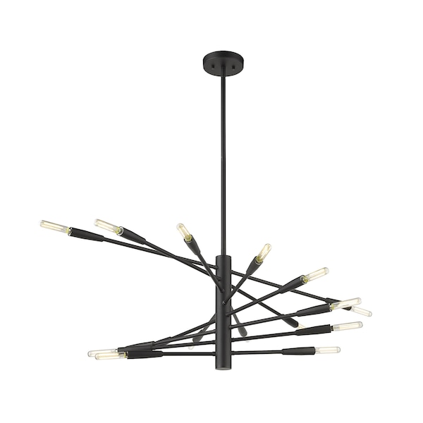Embrace a unique ability to customize the silhouette of this sleek light fixture, a space-inspired design from the Ascension collection. This sixteen-light chandelier doubles down on contemporary attitude with a linear silhouette made up of a down rod, canopy, and adjustable arms fashioned of bold matte black finish steel. Choose a design that complements a dining table or entertaining space while infusing modernistic style and a fresh look.
