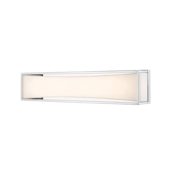 Sleek, gleaming lines of chrome finish metal give this two-light vanity light a clean, modern look. Perfect for a powder room, it boasts a delicate, frosted white shade that diffuses the light into a soft, graceful glow.