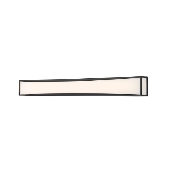 Clean and modern, this two-light vanity light showcases sleek, slim lines of matte black finish metal. Perfect for a powder room, it boasts a delicate, frosted white shade that diffuses the light into a soft, graceful glow.