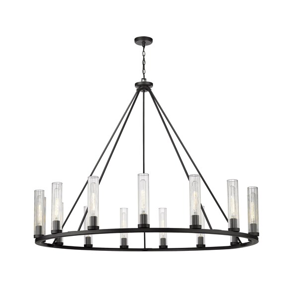 Indulgent castle-inspired vibes bring a delightfully bold look in the Beau fifteen-light chandelier, a captivating choice for highlighting kitchen islands and dining spaces. Transitional in motif, this circular fixture suggests industrial aesthetics with a cool bronze finish steel frame dotted with slender tube shades fashioned of fluted glass.