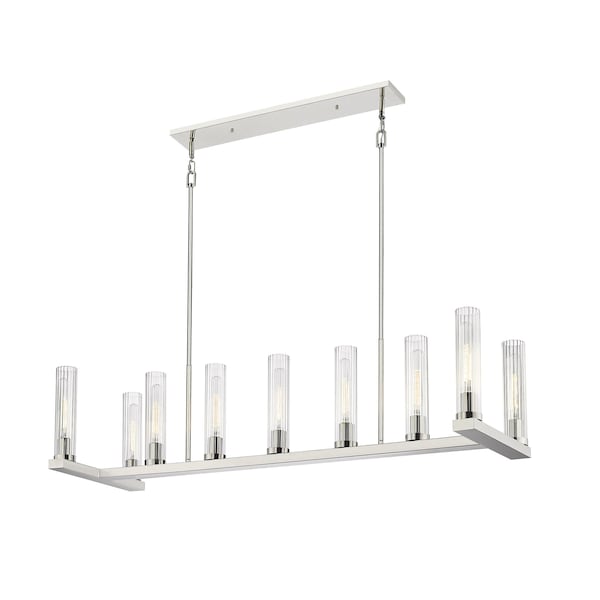 Brilliant radiance and a sleek linear silhouette team up to offer stunning beauty in the Beau nine-light island/billiard light. Bring the lore of industrial-inspired no-nonsense charm with a shimmering facet of polished nickel finish steel and sparkling clear fluted glass shades, all arranged in a linear fashion. This light frames a kitchen island, billiards table, or any element in a custom living area.