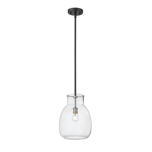 Gleaming brushed nickel accents blend with a sleek, matte black frame to give this single-light mini pendant a chic, modern look. Its clear glass shade casts a brilliant glow that beautifully illuminates any room.