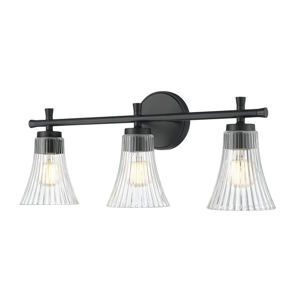 Striking in a matte black finish, this three-light vanity fixture blends bold lines with soft, sparkling curves. The fluted clear glass shades shimmer like cut crystal, adding romantic flair to this structured silhouette. Its an elevated mix of contrast and grace thats designed to stand out.