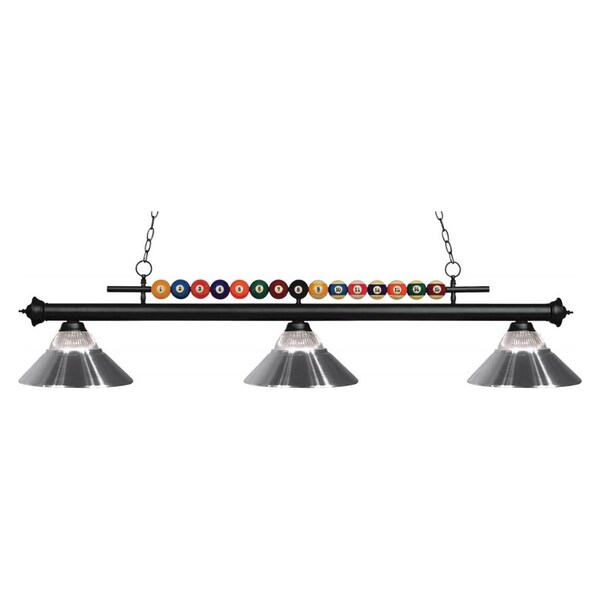 Playful pool ball motifs best describe this beautiful three light fixture. Finished in Matte Black and paired with Clear Ribbed Glass and Metal Chrome shades, this three light fixture would be at home in the game room. 72 inches of chain per side is included to ensure the perfect hanging height.