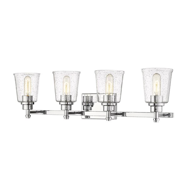 Frame a master or guest bath sink with elegance, and add this chrome four-light vanity light to a new or remodeled bath space. Contemporary and transitional, its versatile motif hits on a beautiful blend of durable steel and soft, delicate bell shades fashioned from clear seedy glass.