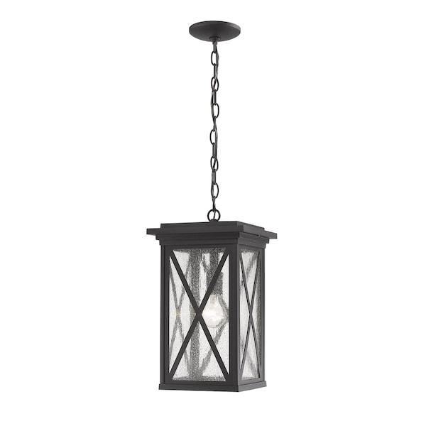 This one-light outdoor chain mount ceiling fixture comes in a box-shaped aluminum black cage with a clear seedy glass finish that softly diffuses light to provide a welcoming glow to your front entrance or patio. Compelling X-accents bring dimension and character. Its classic design goes with any outdoor decor, and makes a beautiful first impression.