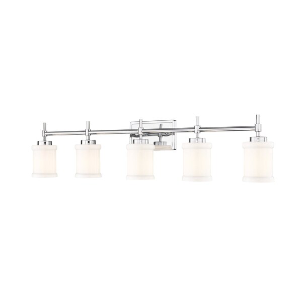 Elegant cuffs on the top and bottom of the glass shades elevate the simple lines of the Cadoc vanity series. Available in a variety of light configurations to accommodate any vanity size, Cadoc is offered in a choice of Brushed Nickel, Matte Black, Chrome, and Modern Gold finishes.Strike a clean, contemporary note over your counter with this modern five-light vanity fixture. Perfect for a master bath, it's designed with impeccable texture and depth, all highlighted with a gleaming chrome finish. Five cylindrical shades are crafted in glossy white glass, complete with cuff embellishments that add rich dimensionality.