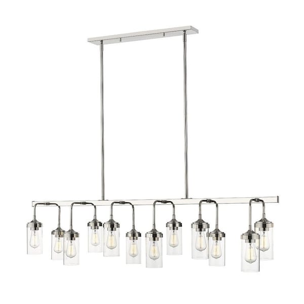 Send a flush of radiant light over a bar or kitchen space with this 12-light island pendant. A carefully designed frame crafted from polished nickel finish steel offers a charming hardware-themed look that showcases cylindrical clear glass shades, adding up to an attention-getting look for a focal point in any space.