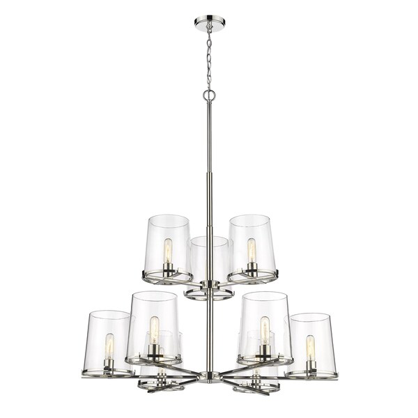 Whether modern or transitional, a custom living space deserves the tasteful design of the Callista nine-light chandelier. Fashioned with a hand-crafted polished nickel finish steel dual-layer frame and circular shade rings, it furthers sophisticated style with nine tapered clear glass shades. Make this fixture a focal point in a kitchen, dining, or main living space.