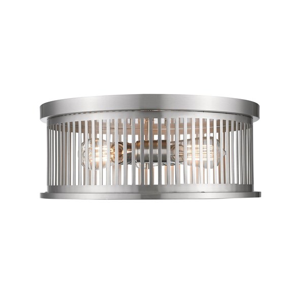 A trio of vintage bulbs nestle in a linear-inspired steel housing that makes up this exceptional fixture. Offering a decidedly industrial attitude, this three-light brushed nickel finish round flush mount ceiling fixture delivers a charming look.