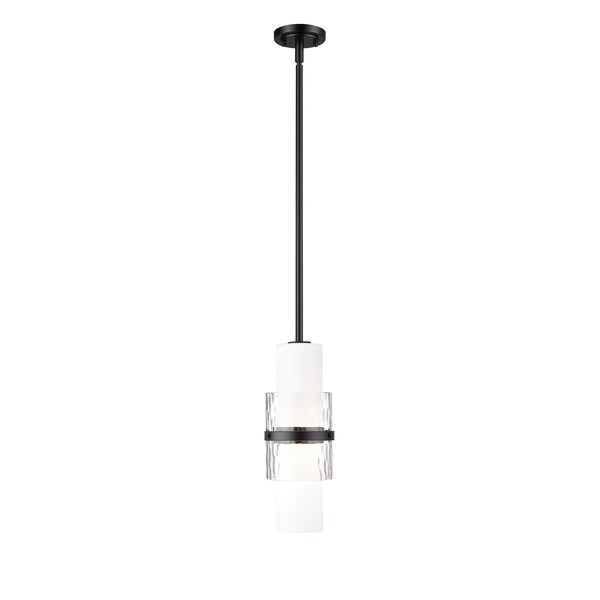 A modern one-light pendant in always stylish matte black introduces sophisticated energy and texture to your home decor. Superbly designed, it centers on a cylinder of etched opal glass that diffuses light beautifully and is augmented with a shorter cylinder of textured clear glass and a decorative cuff in a matching finish. Simply stunning in series over a kitchen island or alone in your den or living room.